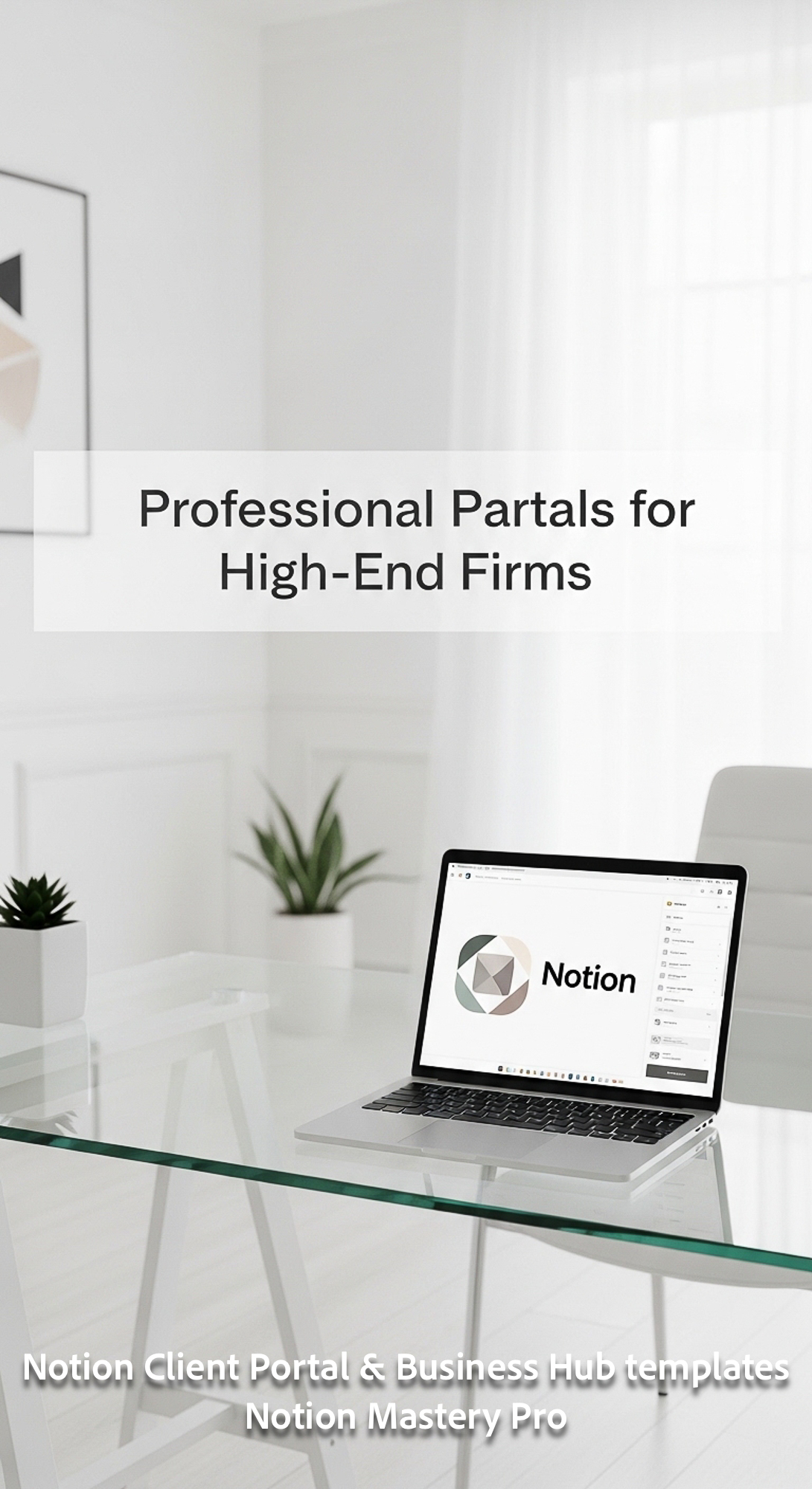 222 Minimalist white office with a glass desk and a MacBook showing a Notion client portal with a cu