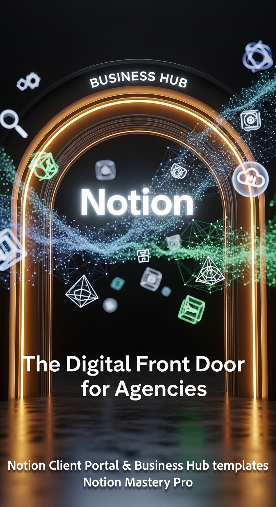 224 Abstract 3D rendering of a Business Hub entrance with a glowing Notion logo and digital assets O