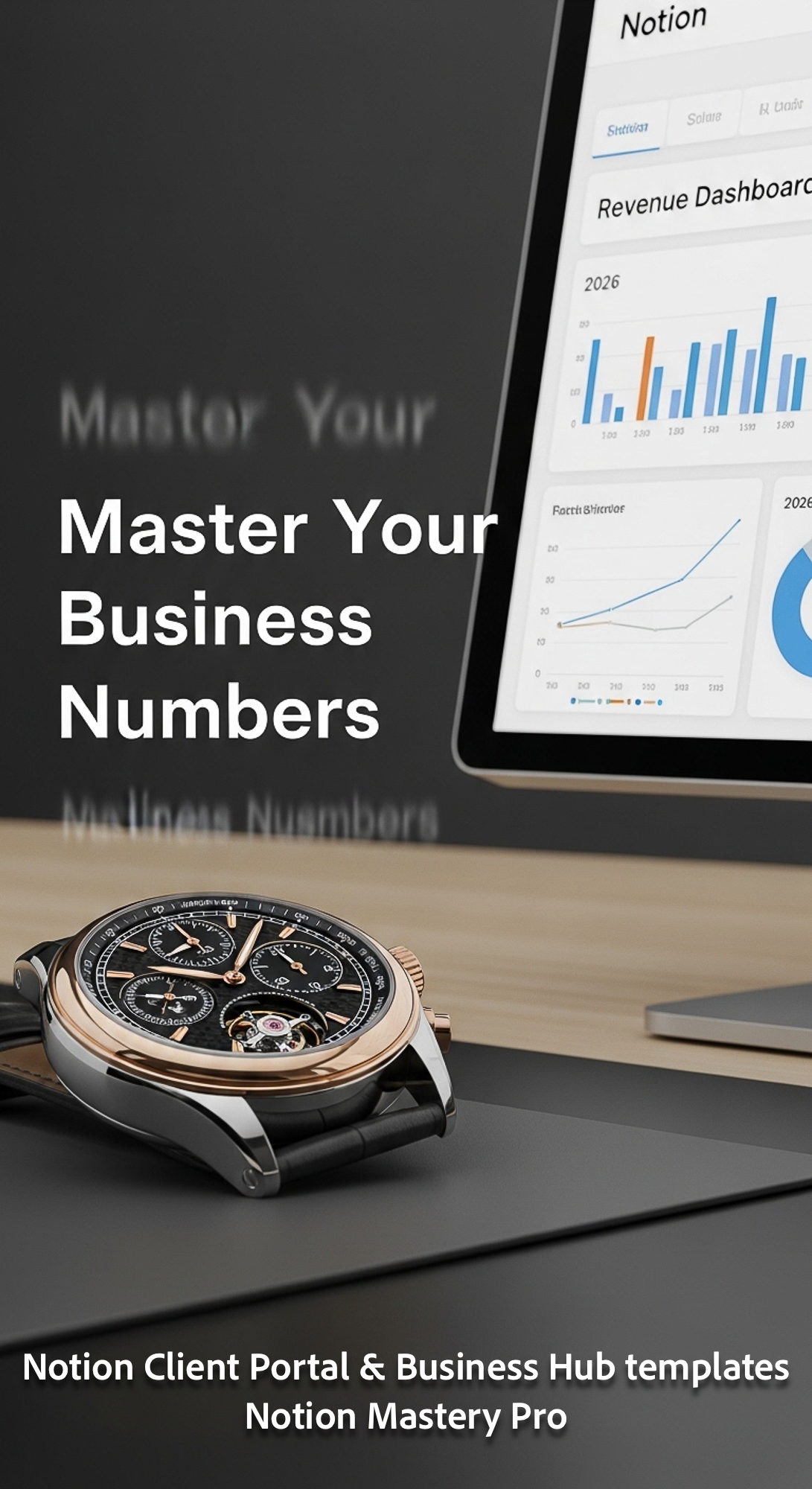 228 Closeup of a designer watch on a desk next to a screen showing a Notion Revenue Dashboard with 2