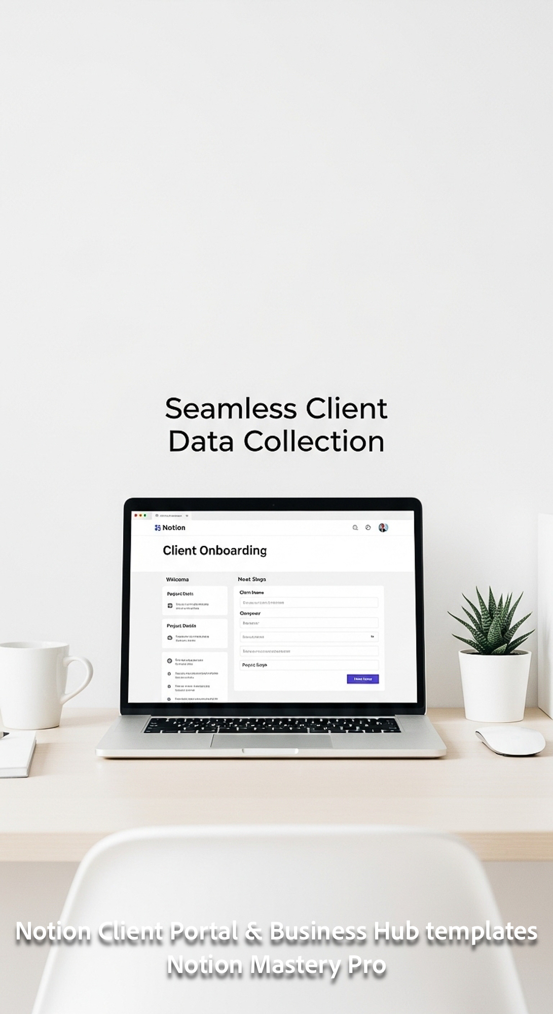 23 Minimalist white workspace with a laptop showing a Notion Client Onboarding page with an embedded