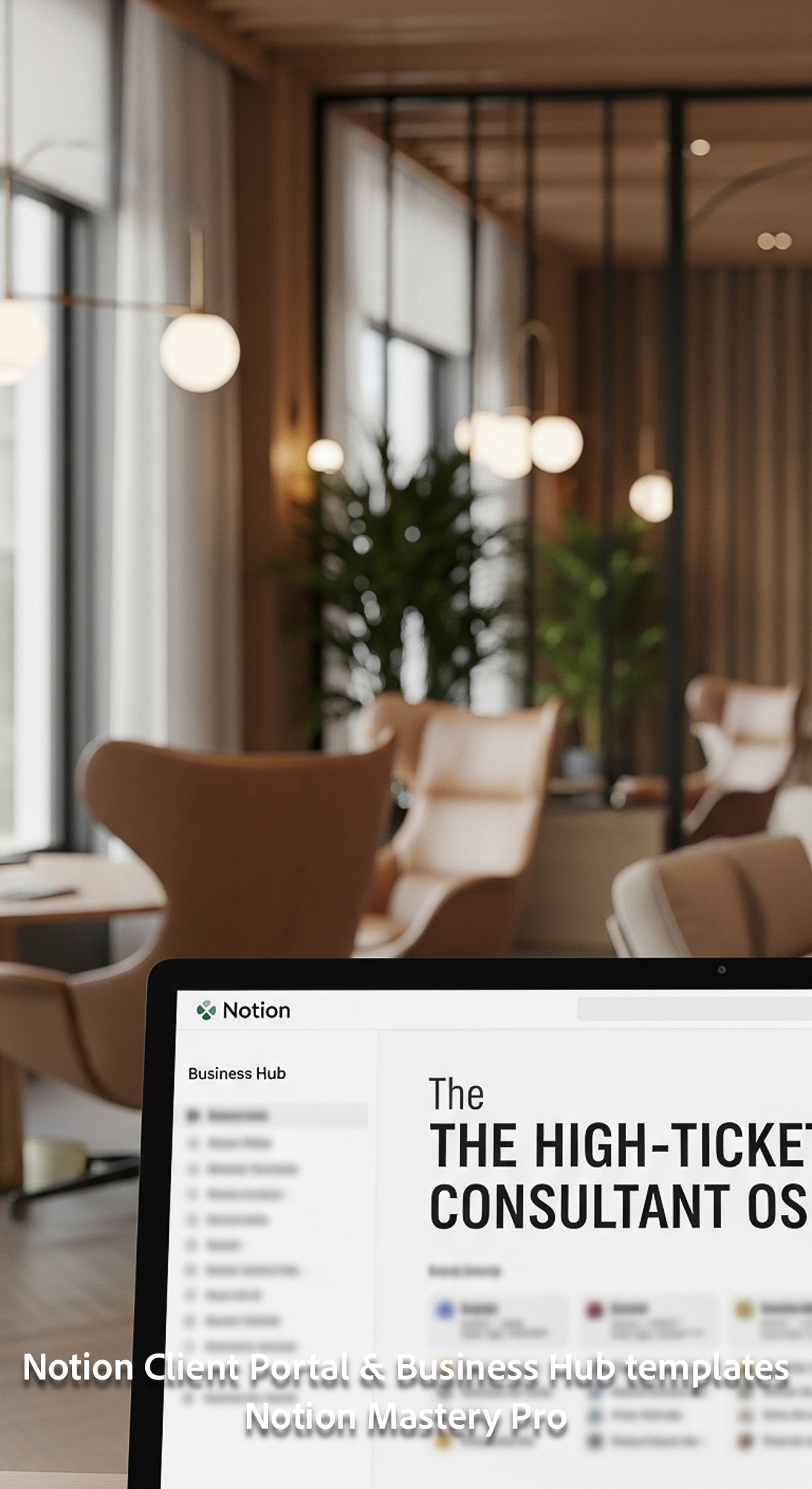 236 Blurred interior of a luxury coworking space foreground screen with a Notion Business Hub naviga