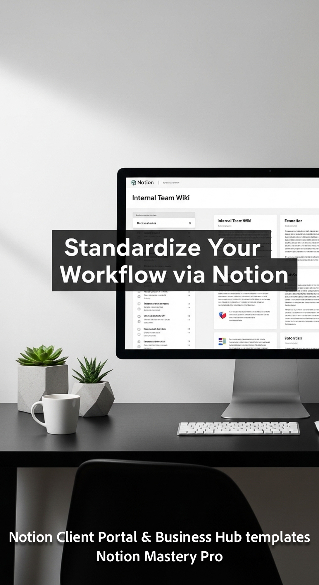 259 Minimalist workspace with a black desk and a monitor displaying a Notion Internal Team Wiki Over