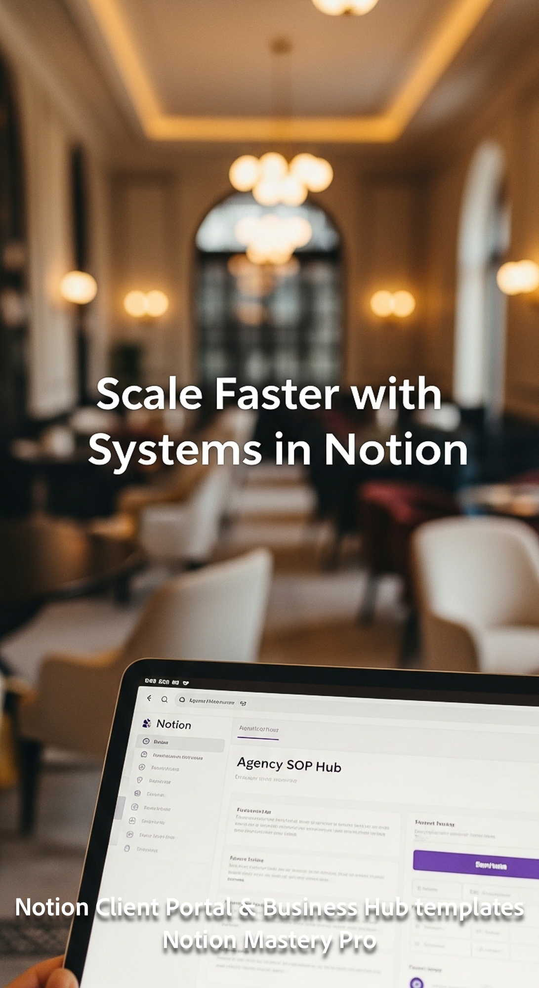 266 Blurred background of a luxury coworking space foreground tablet showing a Notion Agency SOP Hub