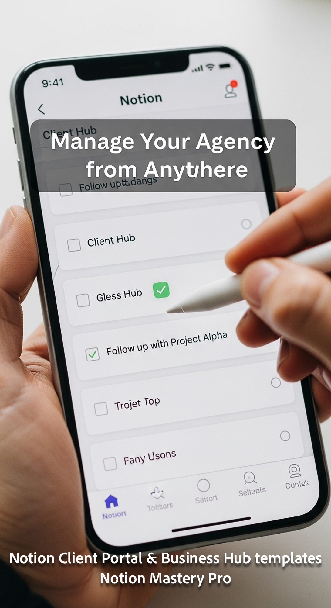 276 Closeup of a hand checkmarking a task in a Notion Client Hub app on a smartphone Overlay Manage