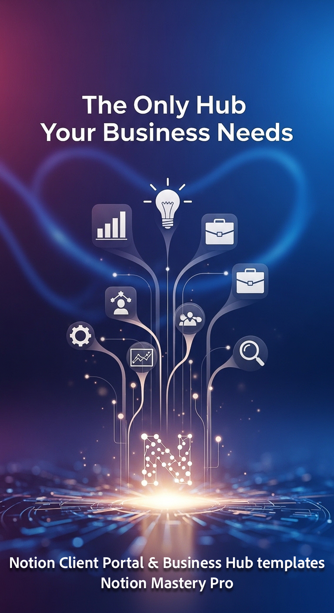 277 Abstract visualization of business icons flowing into a central Notion Operating System hub icon