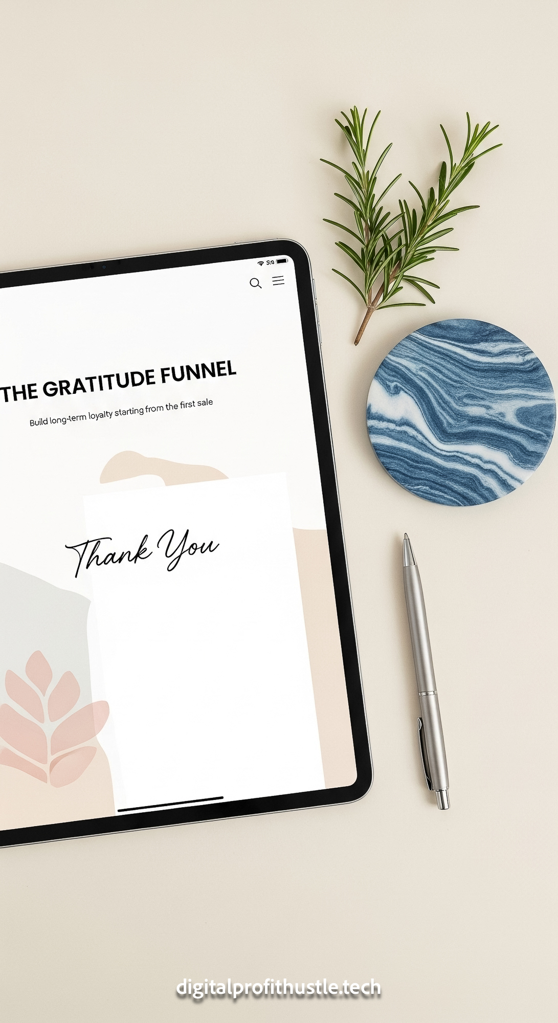 29 Flat lay of an iPad displaying a Thank You page a silver pen a blue marble coaster and a sprig of