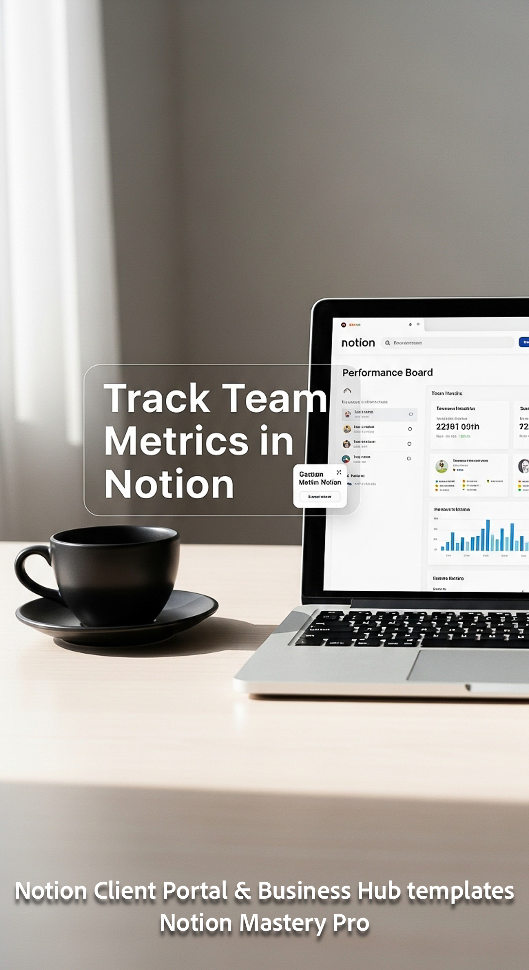 296 Minimalist desk with a black coffee cup and a laptop showing a Notion Performance Board Overlay