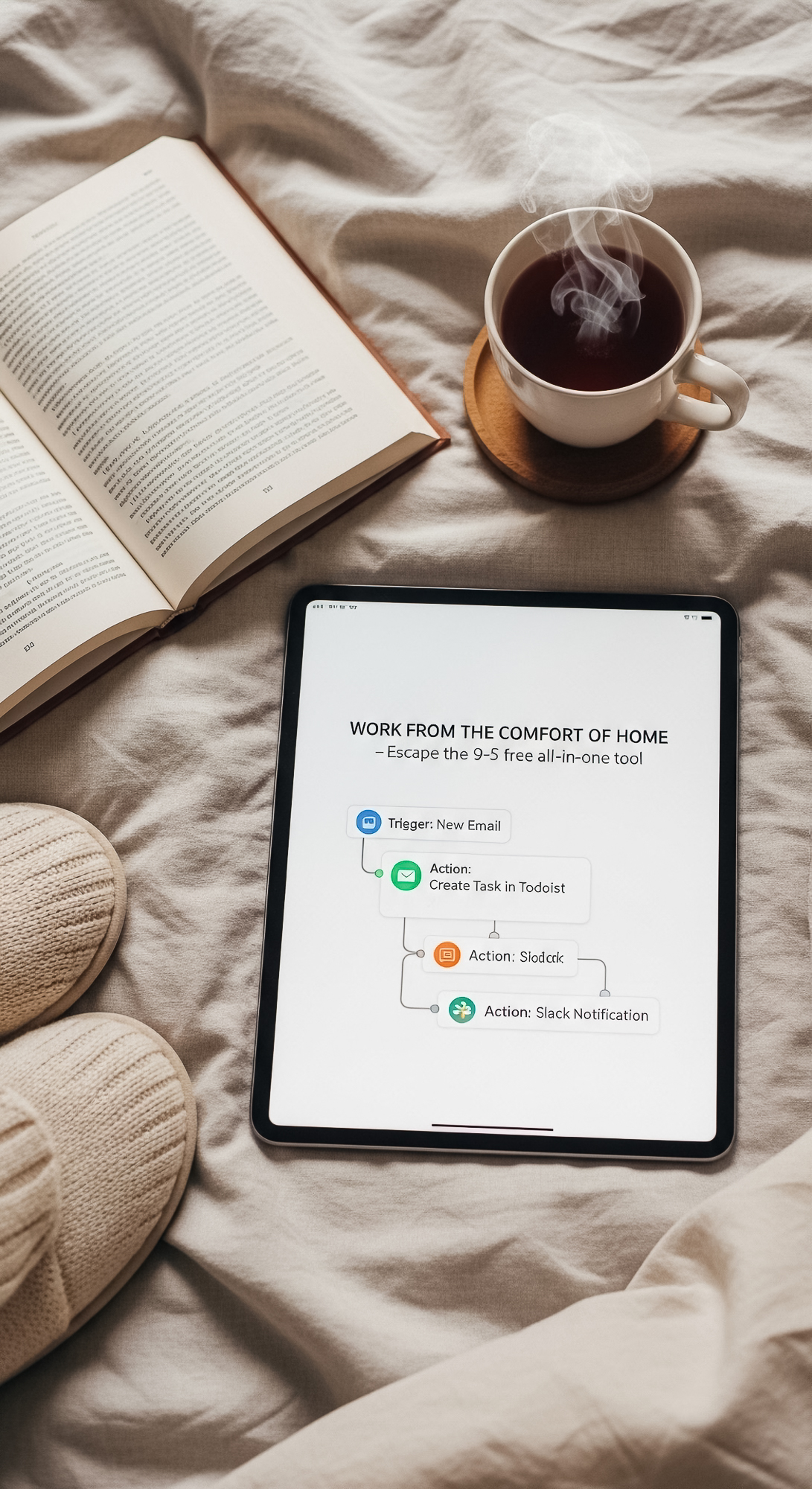 3 Flat lay of an iPad showing a simple 3step automation workflow a pair of cozy slippers edge of fra