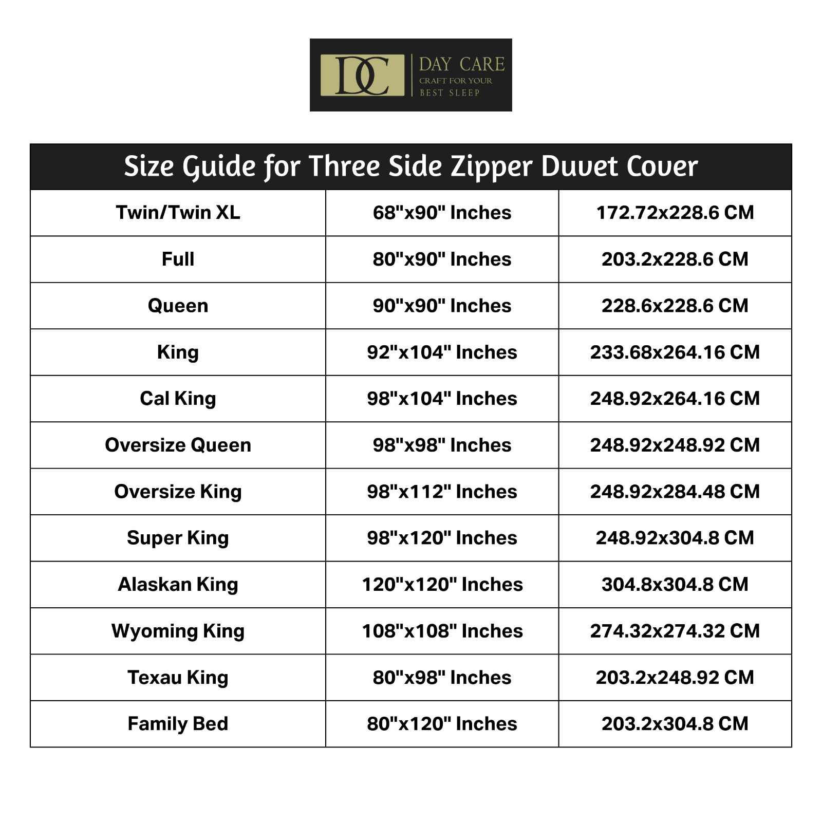 3 Side Zipper duver Size Guide