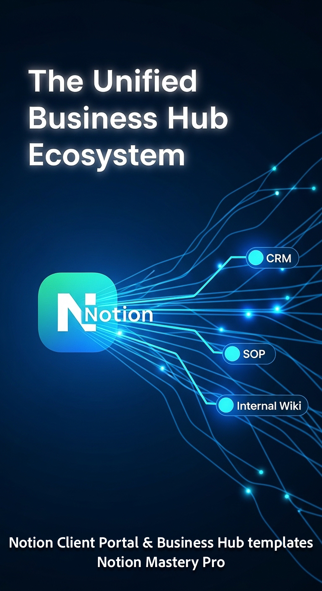 306 Abstract glowing blue network connecting a Notion logo to CRM SOP and Internal Wiki Overlay The