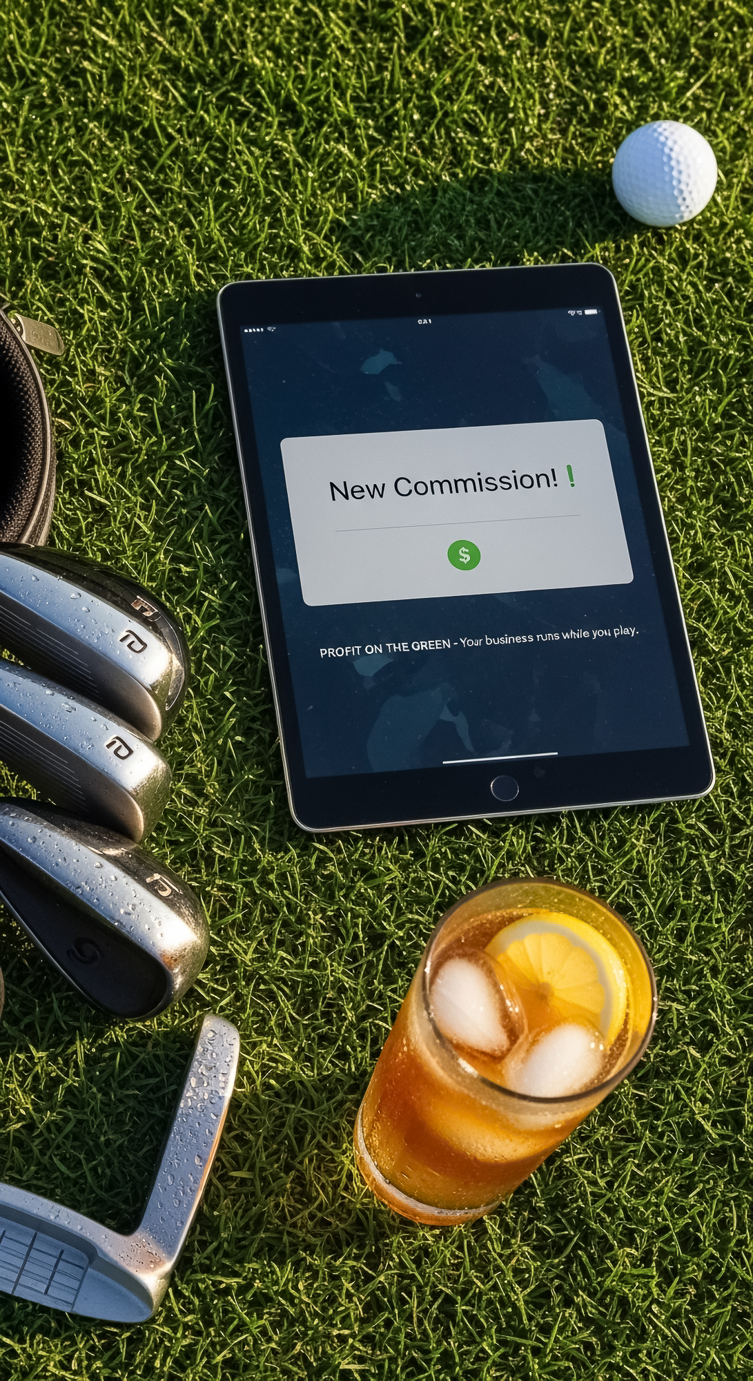 32 Topdown view of an iPad showing a New Commission alert a set of golf clubs edge of frame a golf b