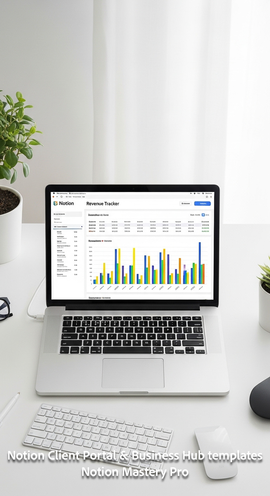337 Topdown desk shot MacBook showing a Notion Revenue Tracker with a colorful 12month chart Overlay