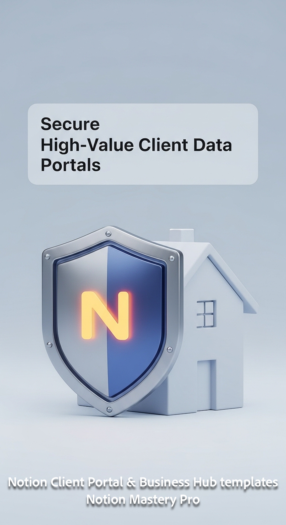 345 Minimalist 3D icon of a digital shield protecting a house with a glowing Notion N logo Overlay S