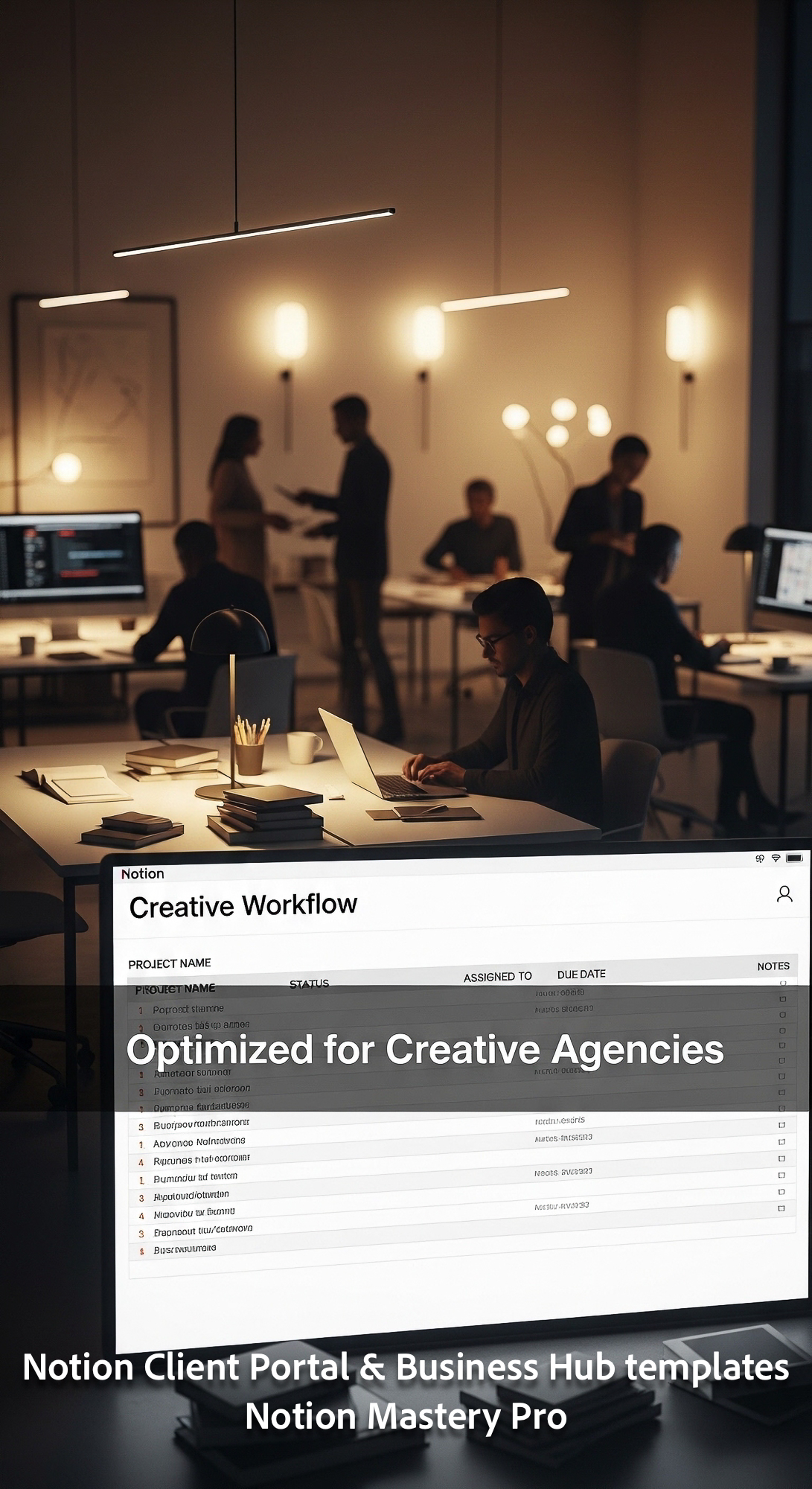 35 Blurred interior of a highend design firm foreground screen showing a Notion Creative Workflow da