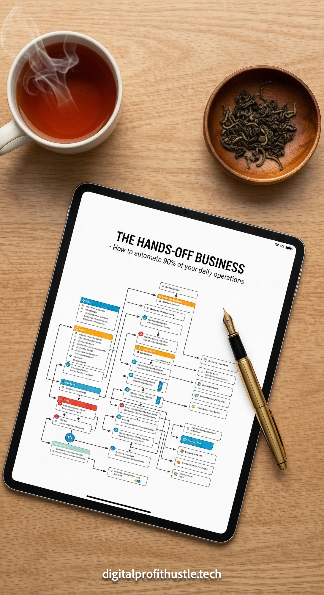 35 Flat lay of an iPad displaying an automated email sequence map a gold fountain pen a small wooden