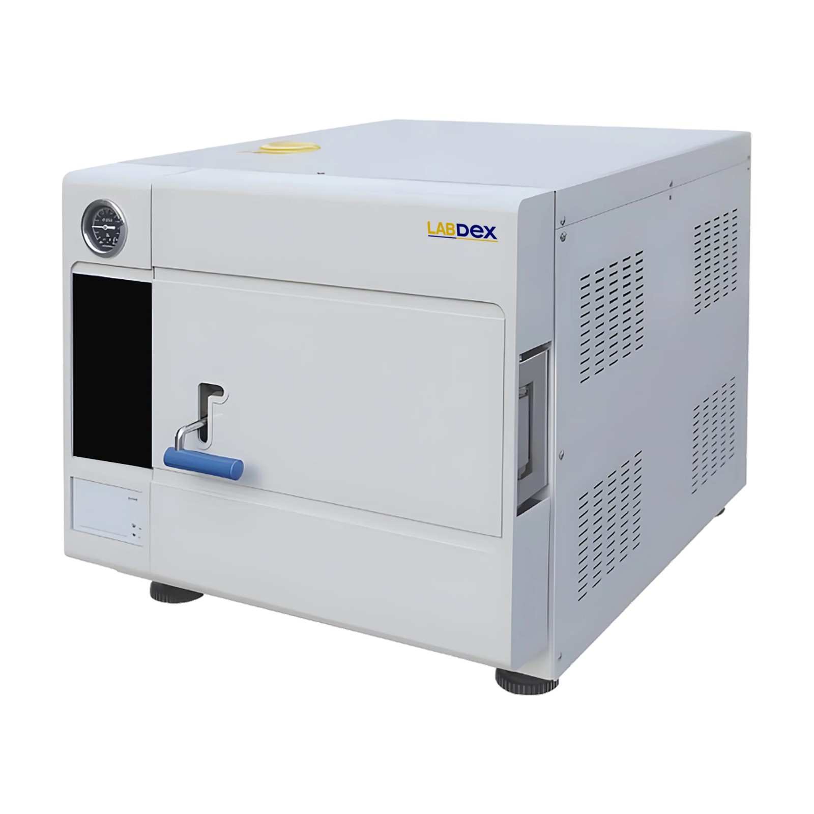 Labdex 35 L Table Top Sterilizer is a front loading Class B steam autoclave with microprocessor control for fast and economical sterilization. It integrates a rapid steam generator, high efficiency vacuum up to –80 kPa, touch screen control, safety door lock, data printing, and protections for medical use.