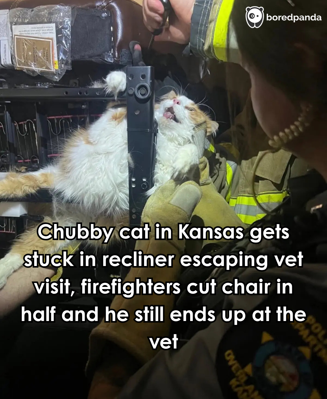 350. Kansas firefighters rescue chubby cat trapped in massive recliner while trying to hide from the