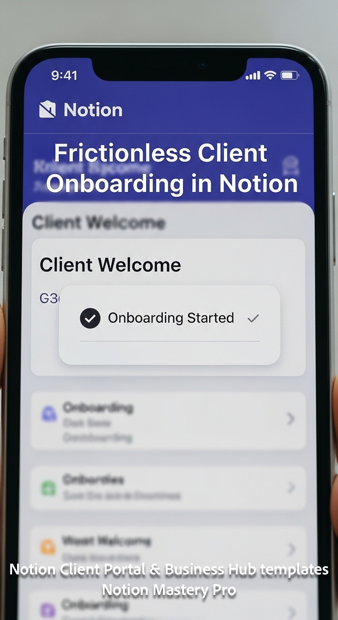 360 Closeup of a smartphone notification Onboarding Started over a Notion Client Welcome screen Over