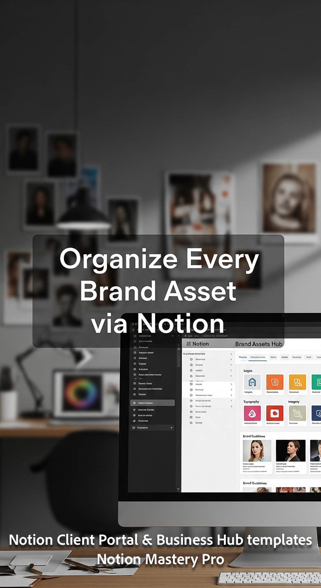 362 Blurred background of a designer studio foreground monitor showing a Notion Brand Assets Hub Ove