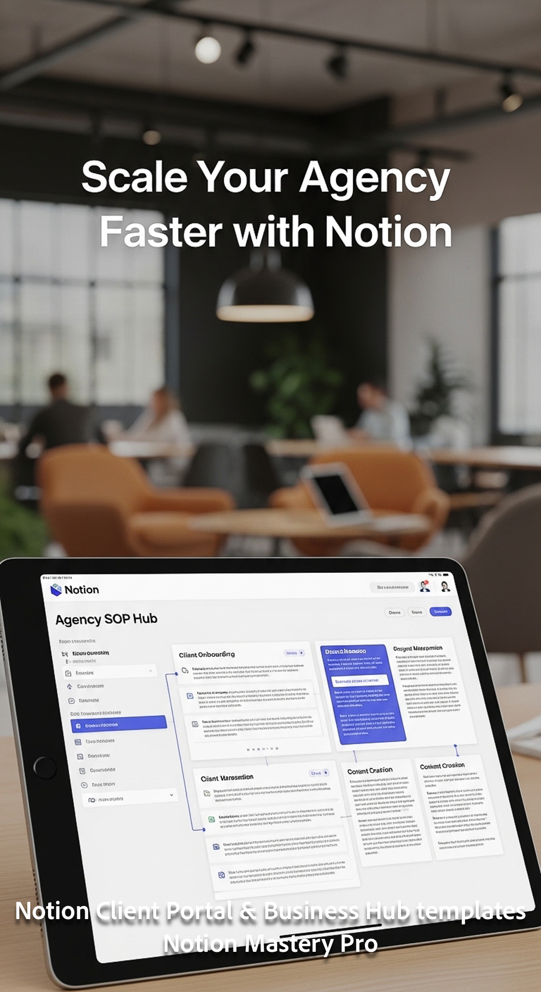 366 Blurred background of a modern coworking space foreground tablet showing a Notion Agency SOP Hub