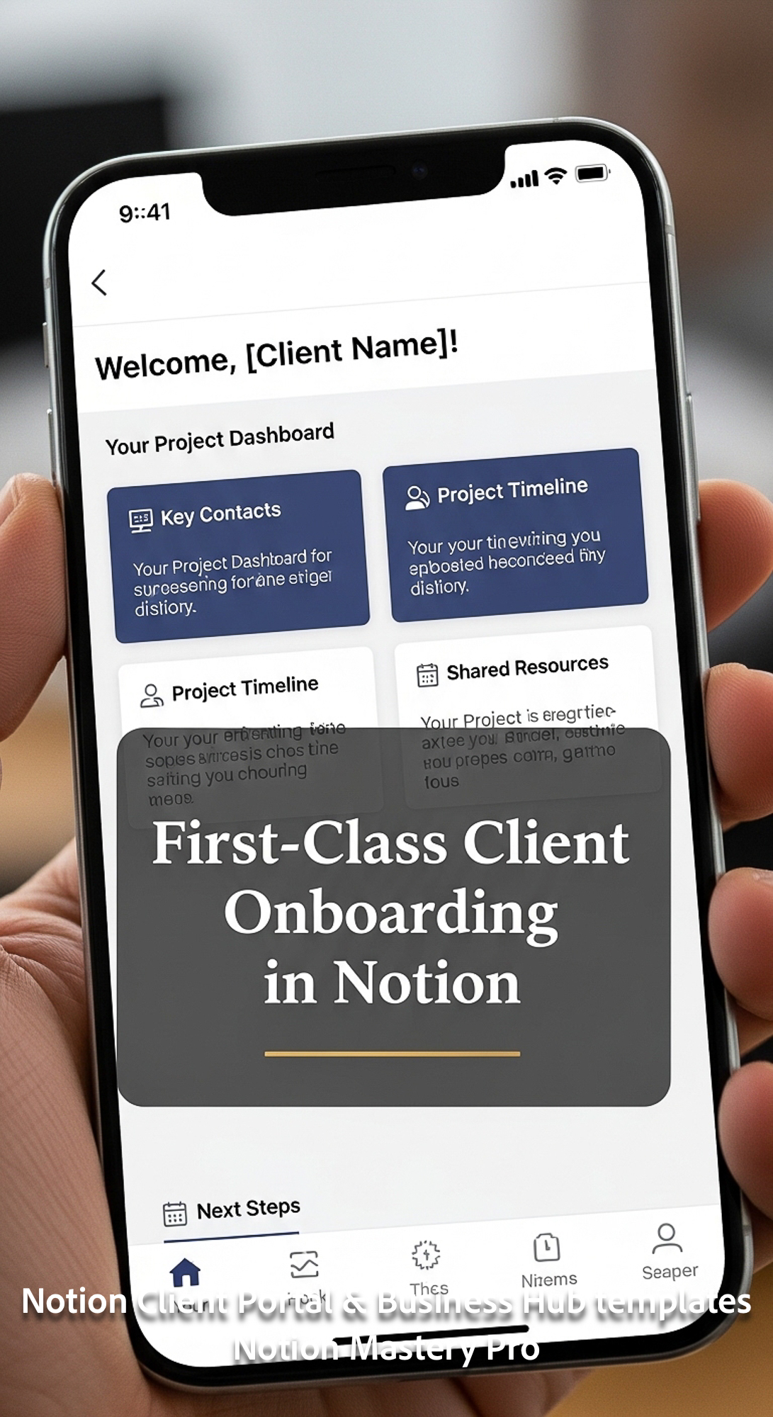380 Closeup of a smartphone displaying a Notion Client Welcome portal for a new highend user Overlay