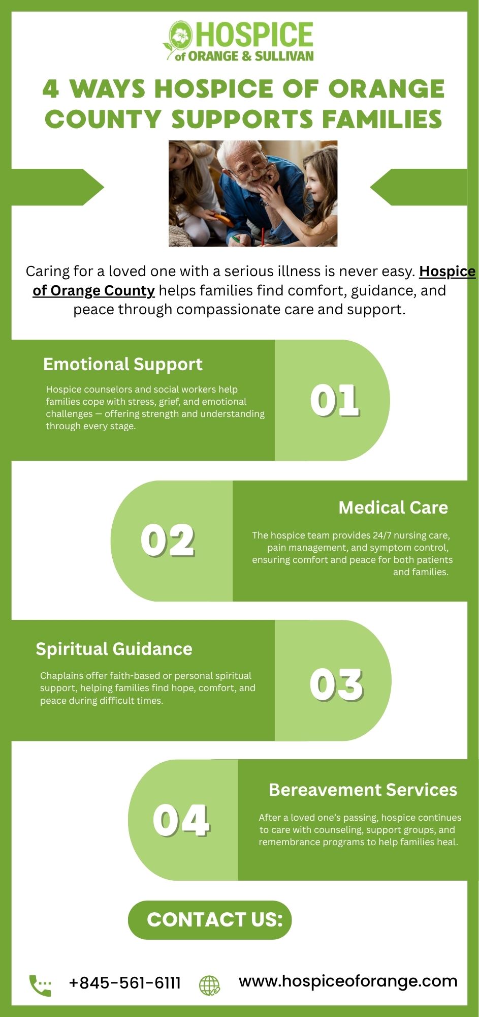 In this infographic, we discuss how Hospice of Orange County helps families in four powerful ways: emotional care, medical support, faith-based comfort, and grief recovery. For trusted guidance, call +845-561-6111 or visit : https://hospiceoforange.com/