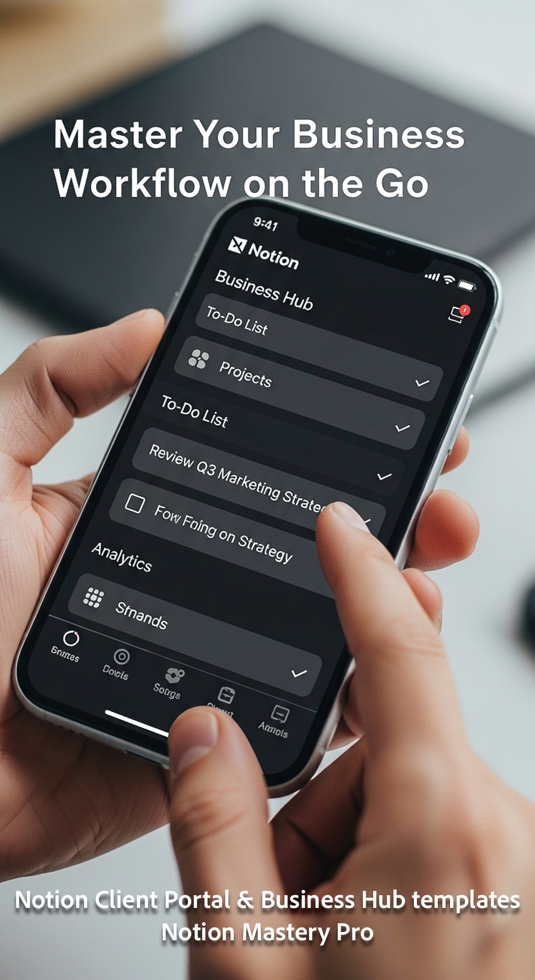401 Closeup of a hand checkmarking a task in a Notion Business Hub mobile app on a phone Overlay Mas
