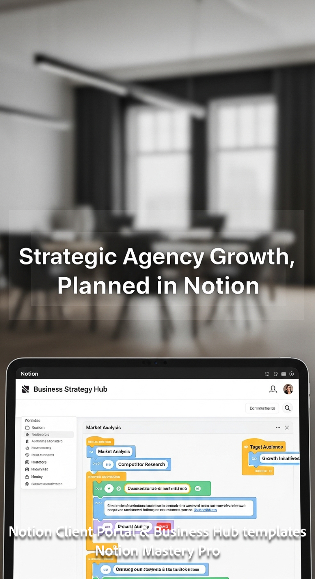 418 Blurred luxury office interior foreground tablet showing a Notion Business Strategy Hub Overlay