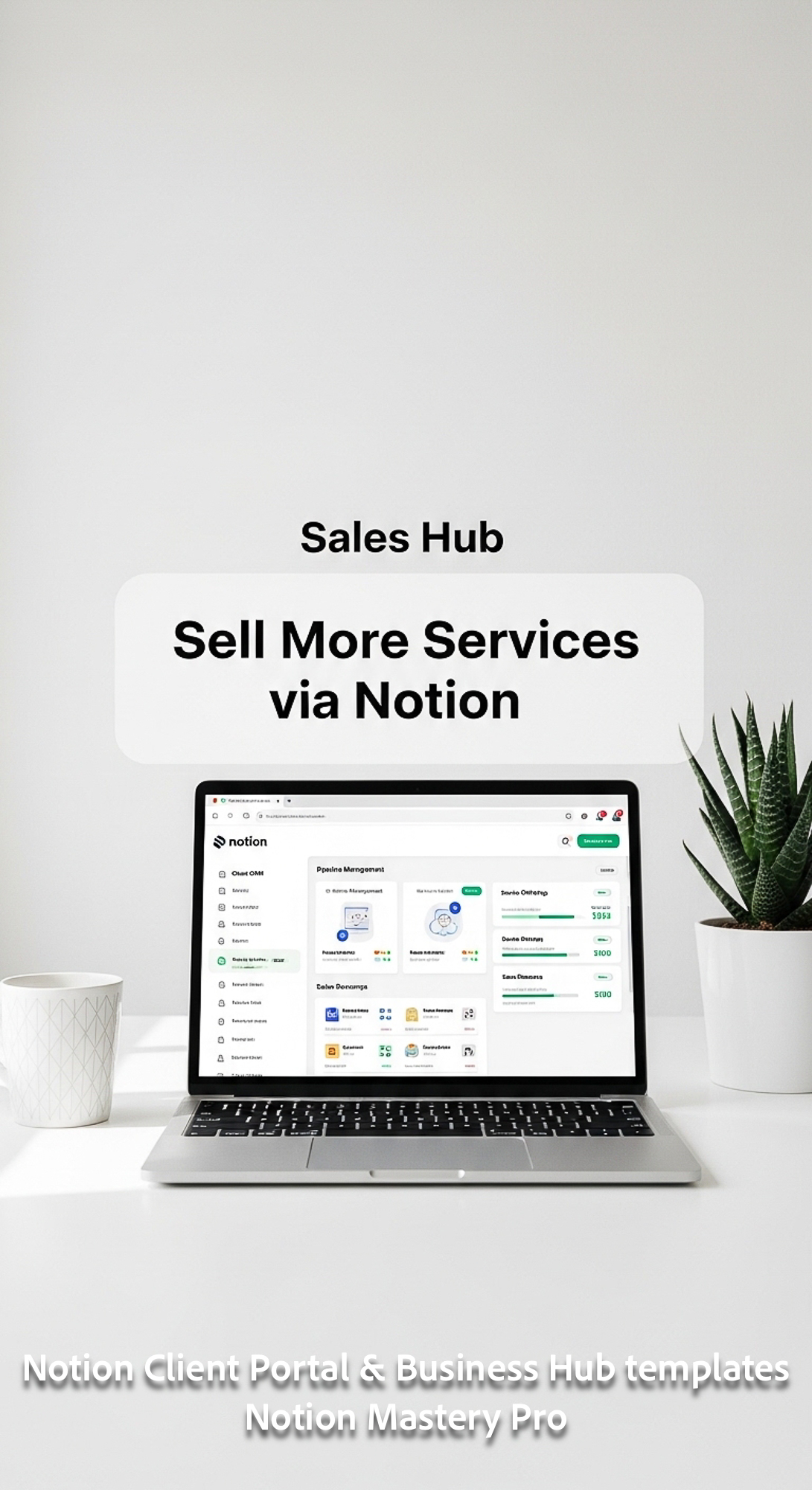 44 Minimalist white workspace with a laptop showing a Notion Sales Hub for service businesses Overla