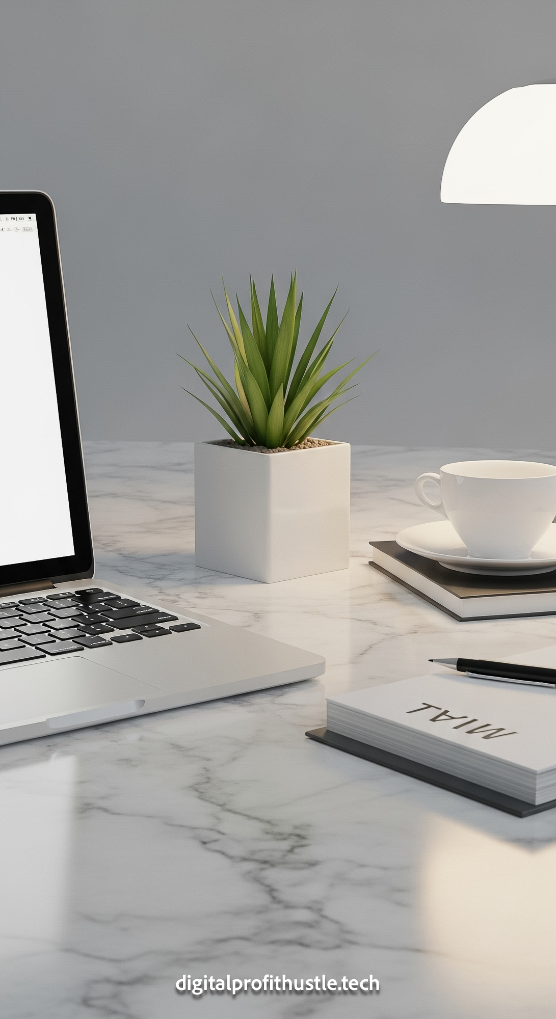 44 Overhead view of an iPad showing a funnel flowchart a gold paperclip a pink calculator and a latt