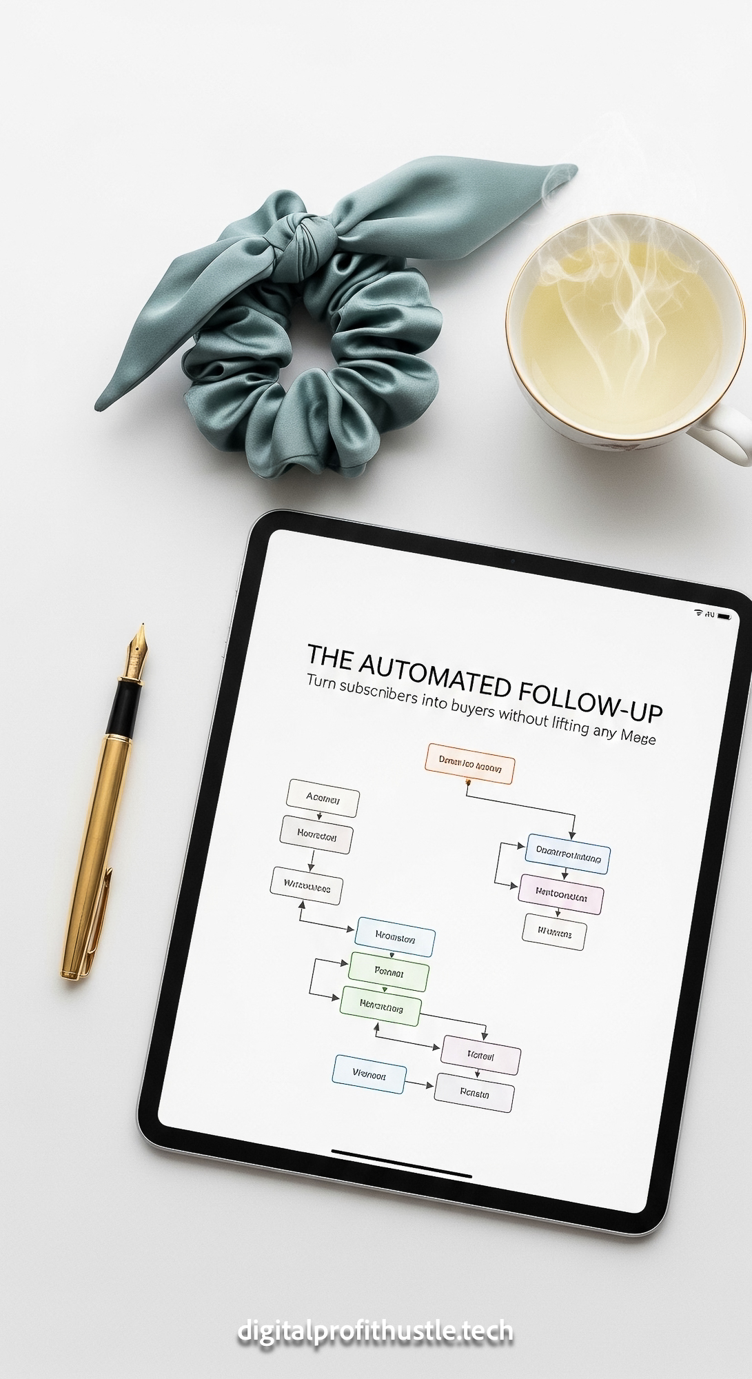 5 Flat lay of an iPad displaying an automated email sequence map a gold fountain pen a silk hair tie