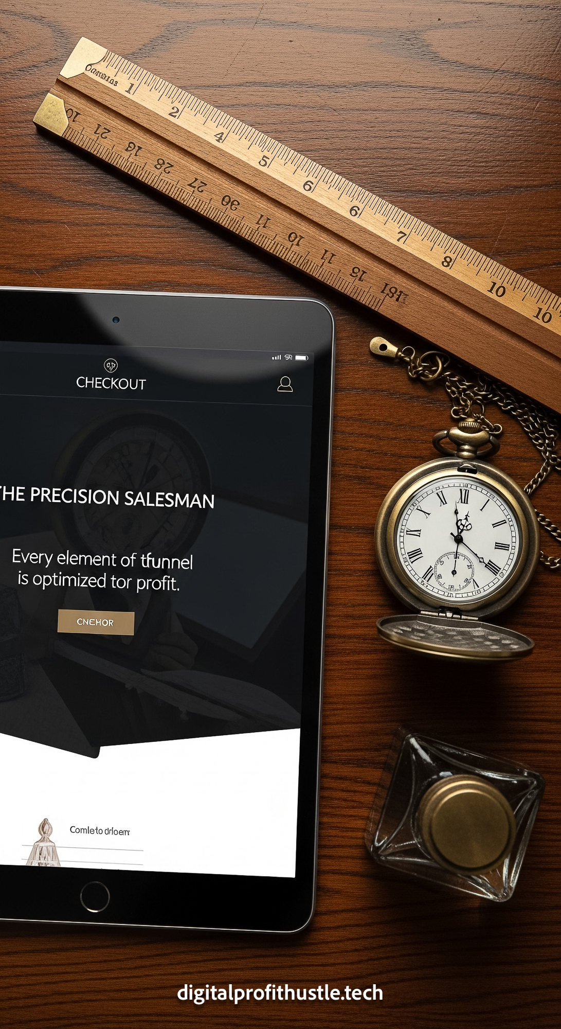 54 Topdown view of a tablet displaying a checkout page a wooden ruler a pocket watch and a small ink