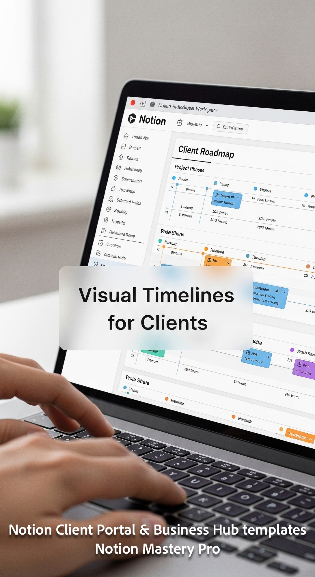56 Closeup of a hand navigating a Notion Client Roadmap with timeline views on a laptop Overlay Visu