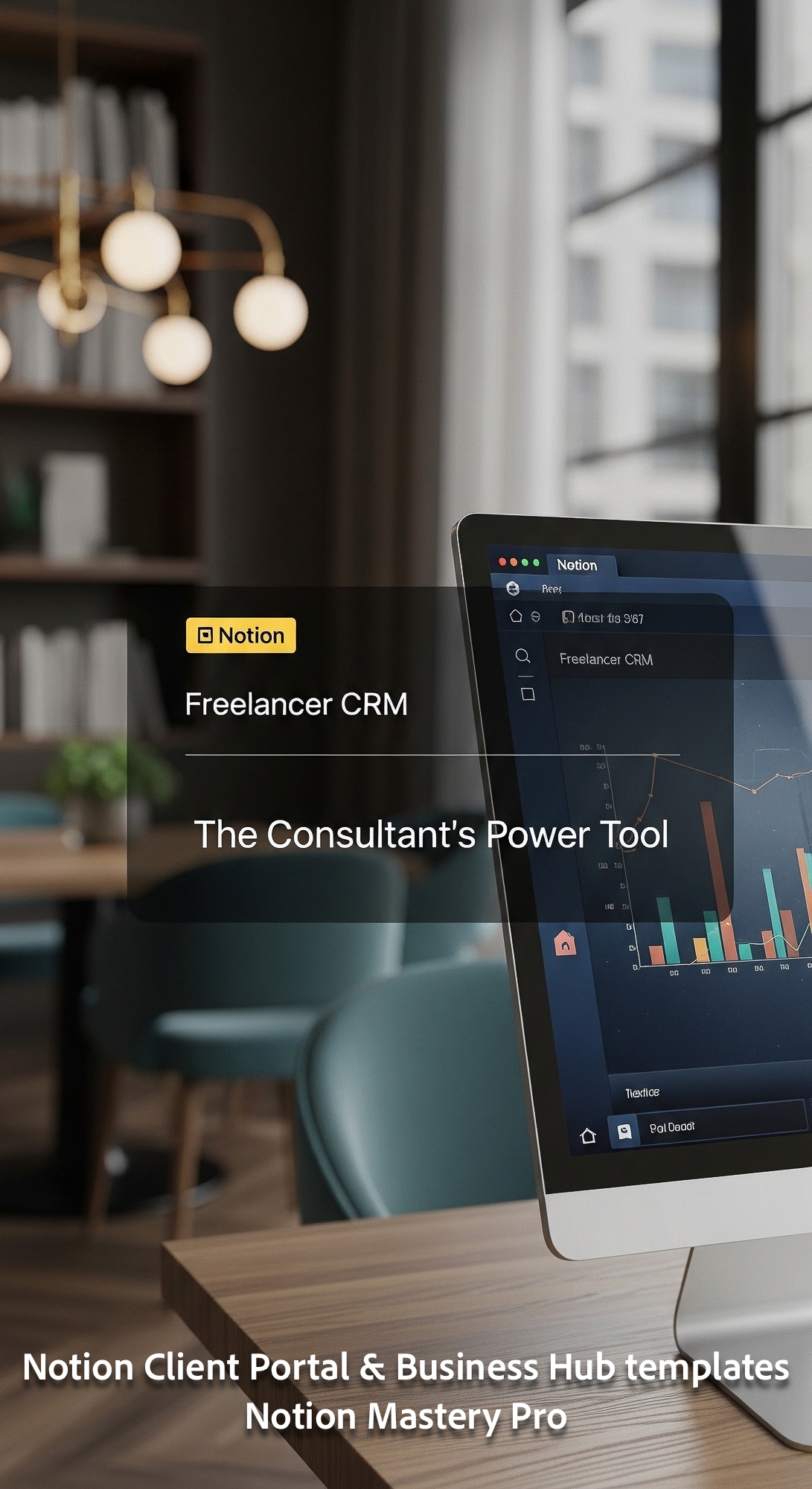 57 Blurred interior of a luxury coworking space foreground screen with a Notion Freelancer CRM Overl