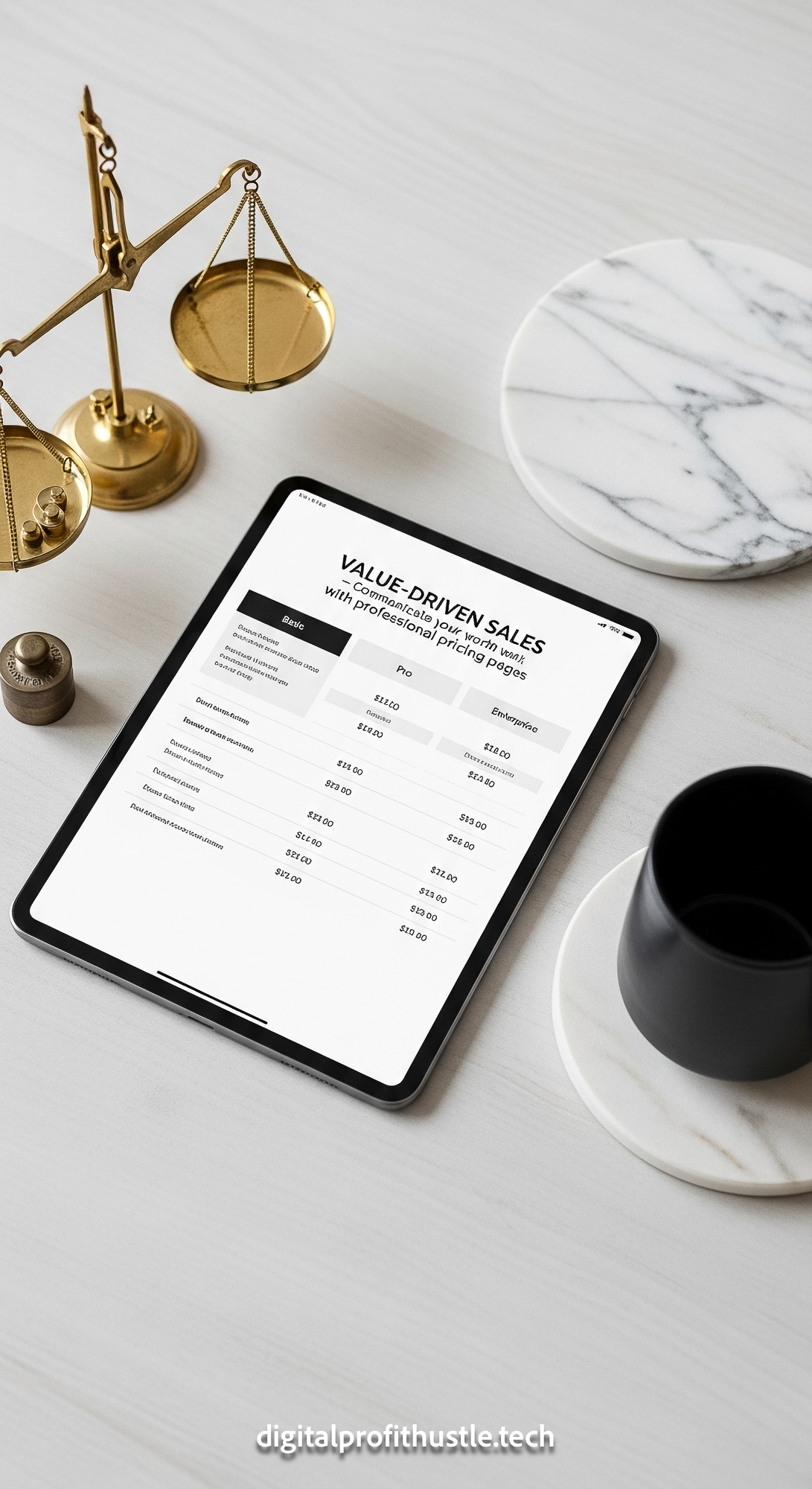 59 Flat lay of an iPad displaying a pricing table a set of vintage scales a white marble coaster and