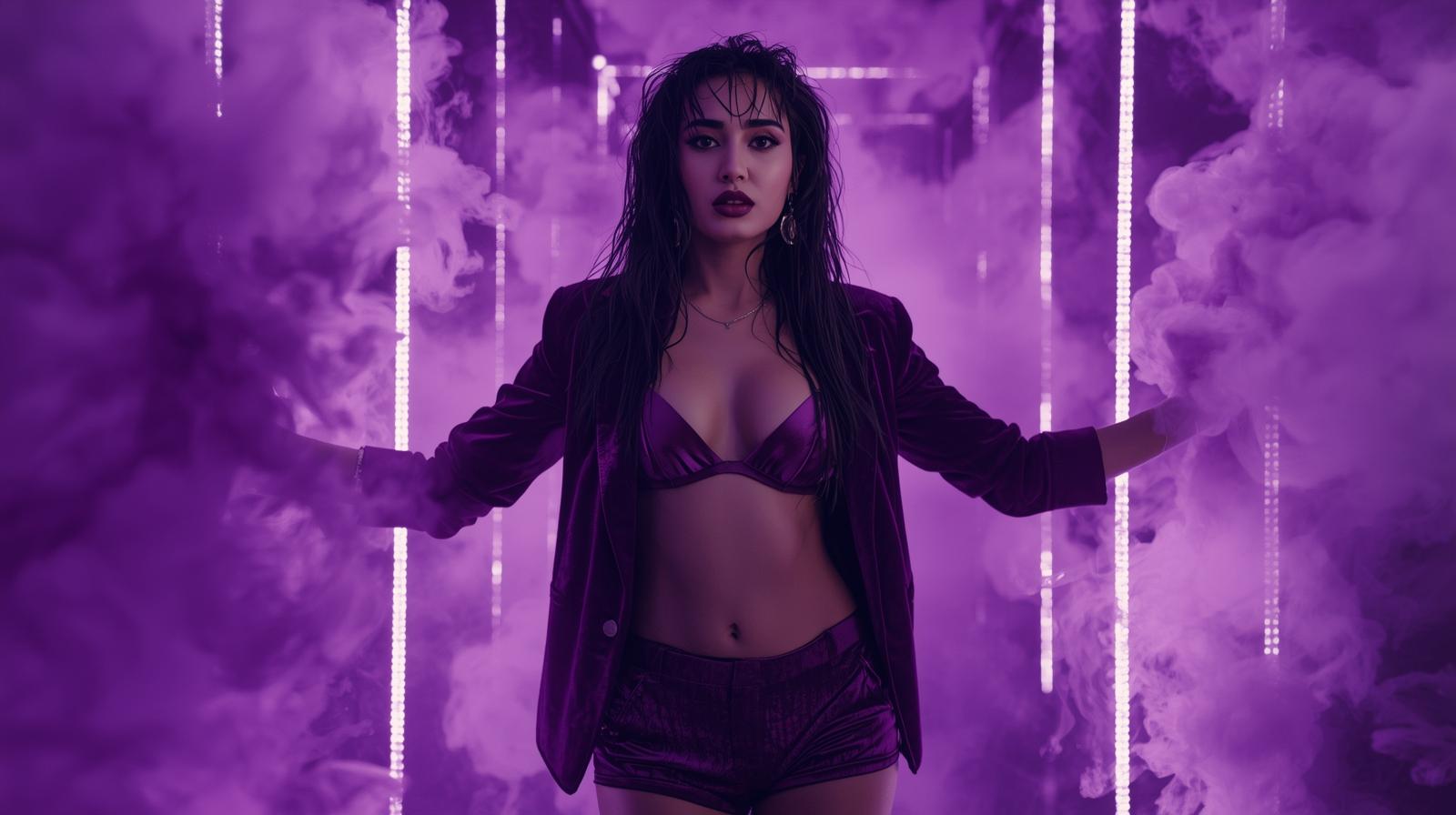 6. A sultry Indian songstress with wet look hair and dark berry lips, in a structured plum velvet bl