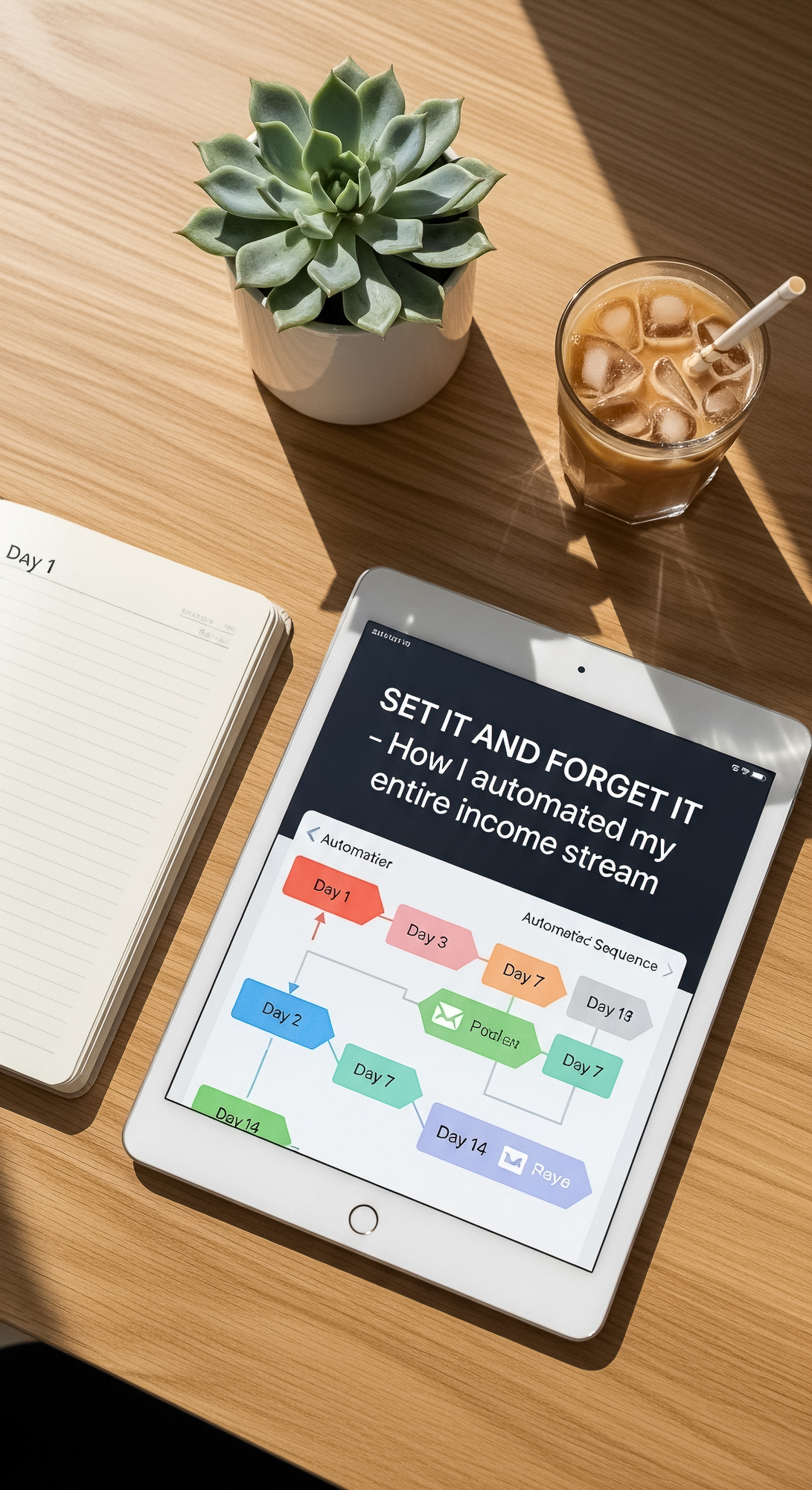 6 Overhead shot of an iPad showing an automated email sequence a Day 1 journal a succulent and a gla