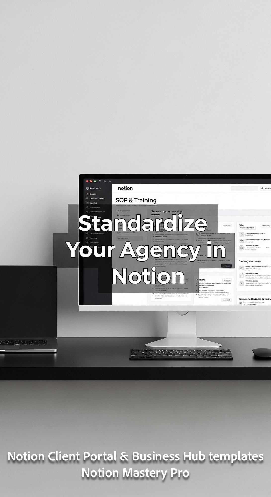 60 Minimalist workspace with a black desk and a monitor displaying a Notion SOP Training hub Overlay