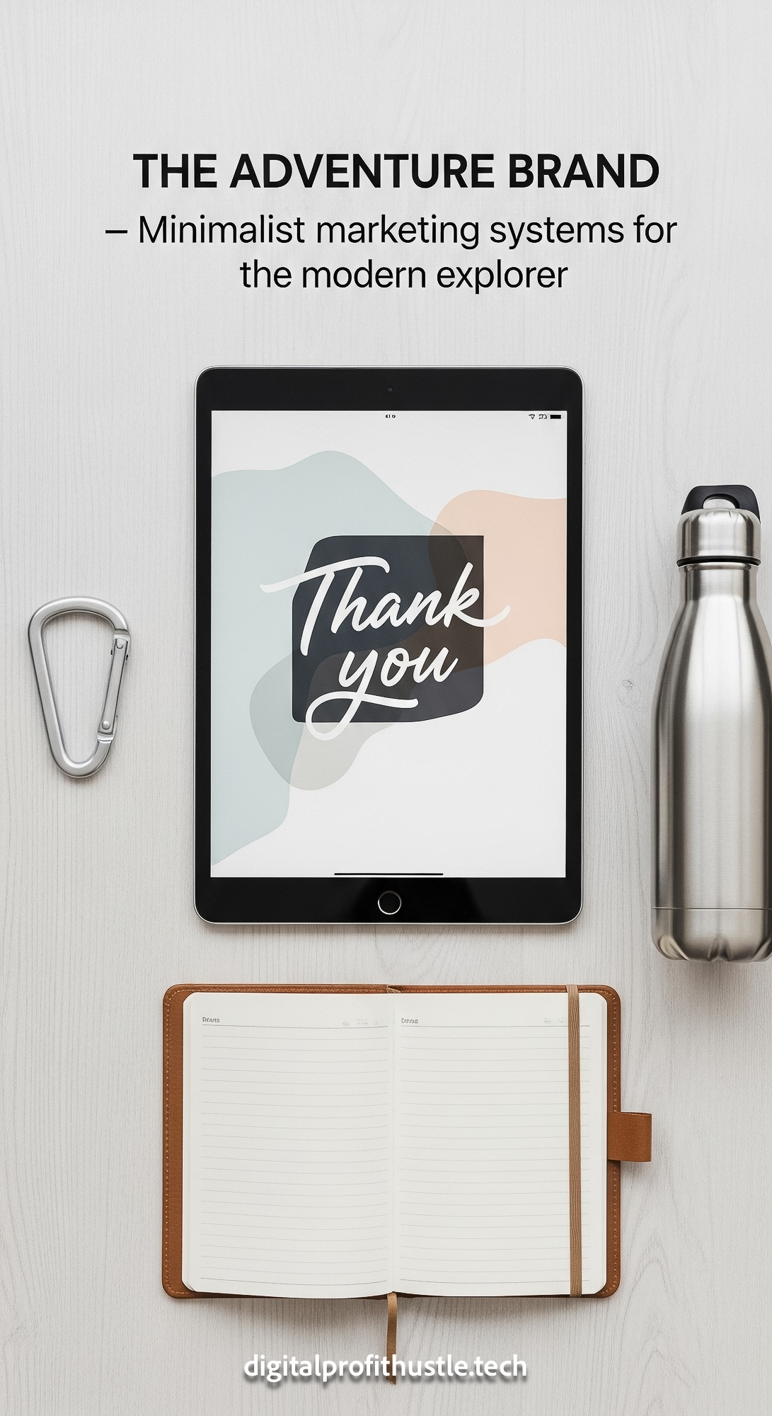 65 Flat lay of an iPad with a Thank You page a silver carabiner a small travel journal and a reusabl
