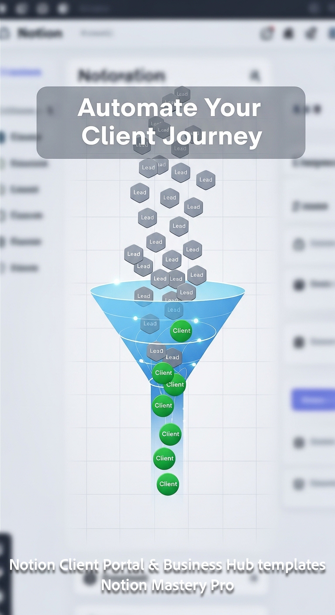 66 Abstract visualization of a funnel turning Lead icons into Client icons inside a Notion grid Over