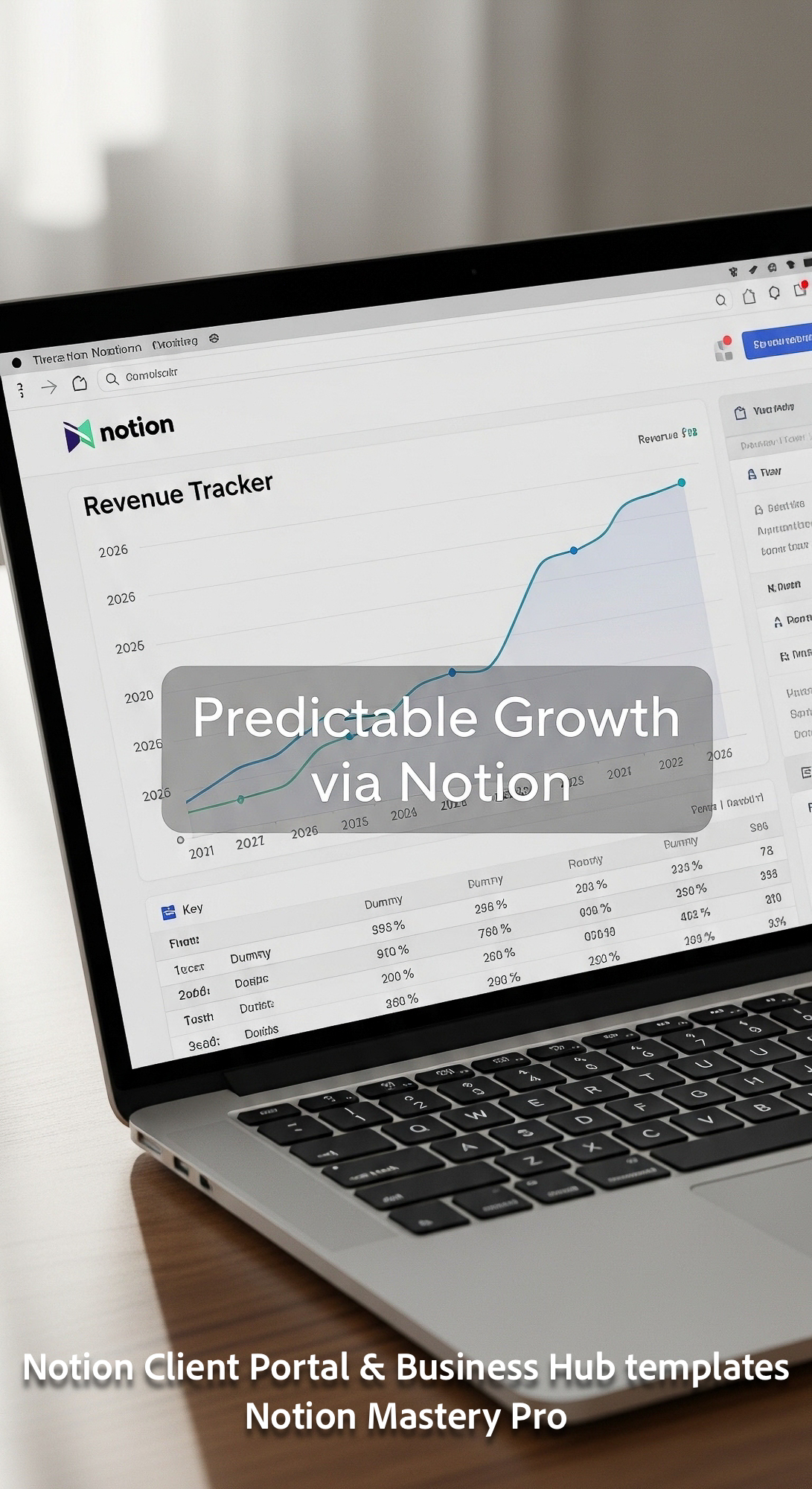69 Closeup of a MacBook Pro showing a Notion Revenue Tracker with a 2026 forecast chart Overlay Pred
