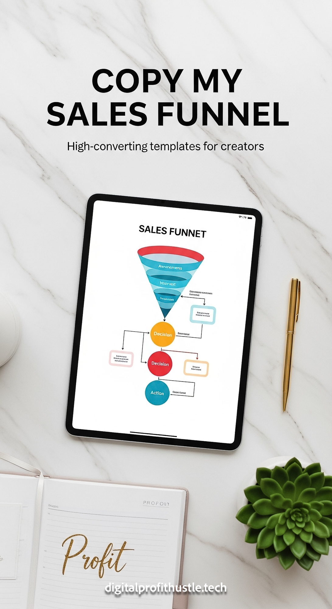 7 A topdown view of a marble desk with an iPad showing a funnel flow chart a gold pen a small succul