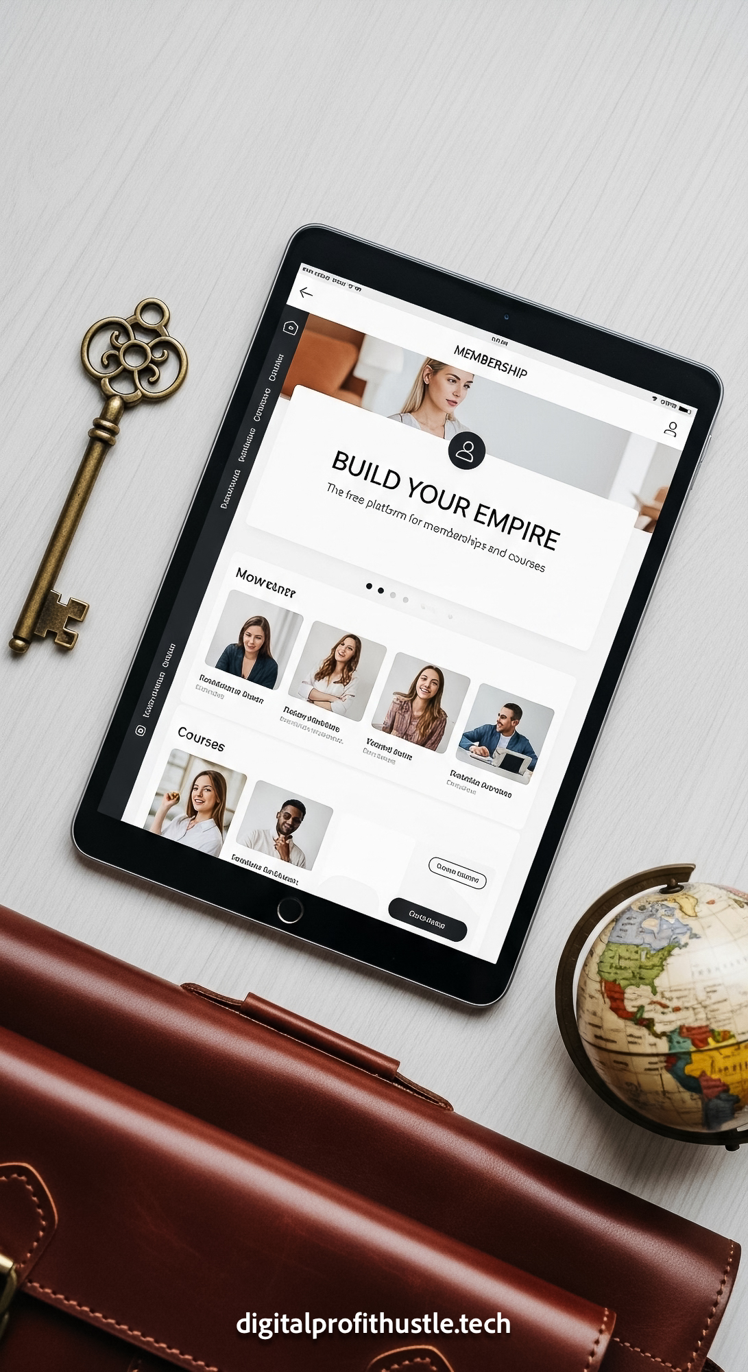 72 Flat lay of an iPad showing a membership portal design a brass key a leather satchel edge of fram