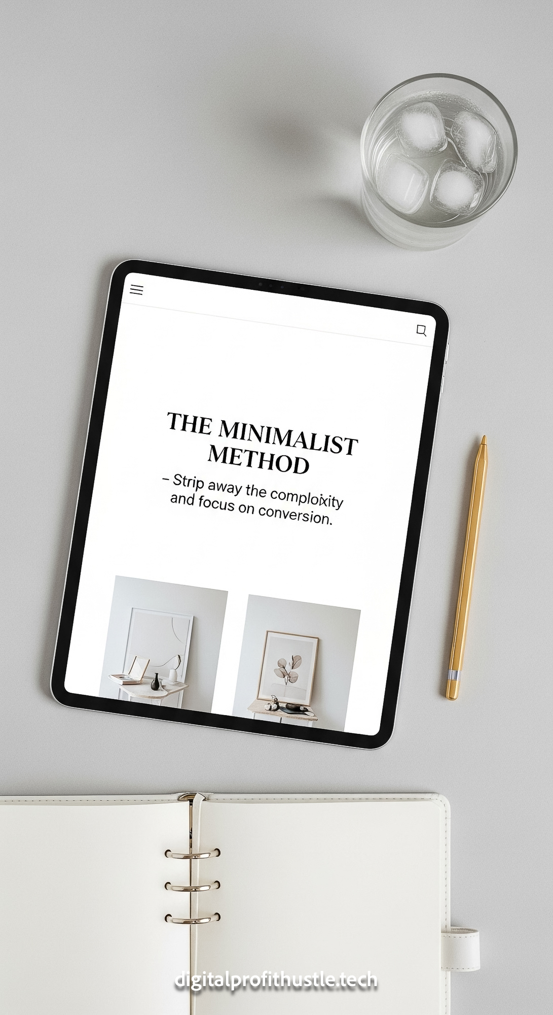 72 Overhead shot of a tablet with a sales page design a gold stylus a white leather notebook and a g