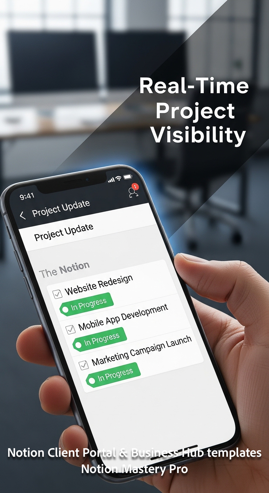 73 Closeup of a smartphone showing a Notion Project Update list with In Progress status Overlay Real