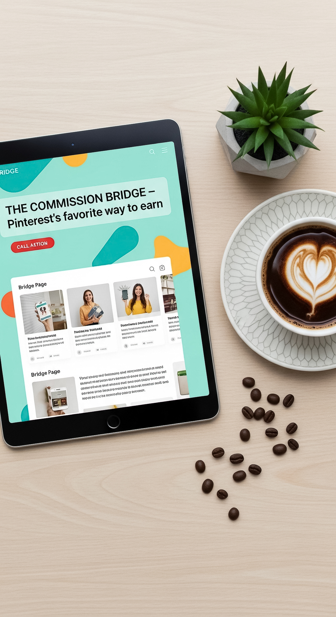 77 Flat lay of a tablet showing a bridge page design and a cup of coffee Text THE COMMISSION BRIDGE
