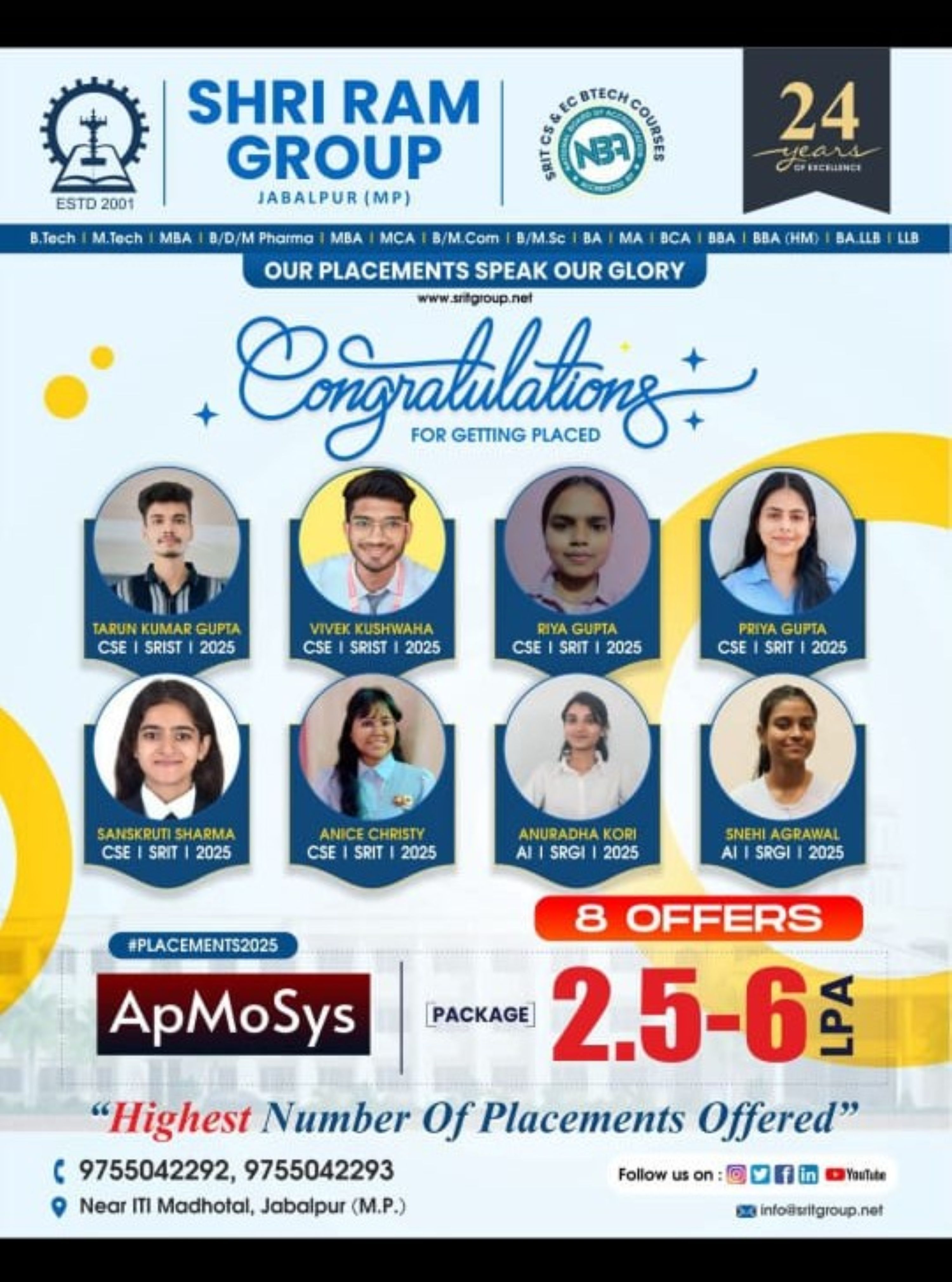 Shri Ram Group Jabalpur is renowned as an engineering college with best placements. This time, 8 students are placed in ApMoSys Technologies Private Limited via the closed campus organized by the institute. Each student will receive the package between 2.5 lacs per annum to 6 lacs per annum. Training and placement experts with other faculty members have wholeheartedly congratulated the placed candidates of SRIT engineering college in Jabalpur for their remarkable achievements and wished for their better future.