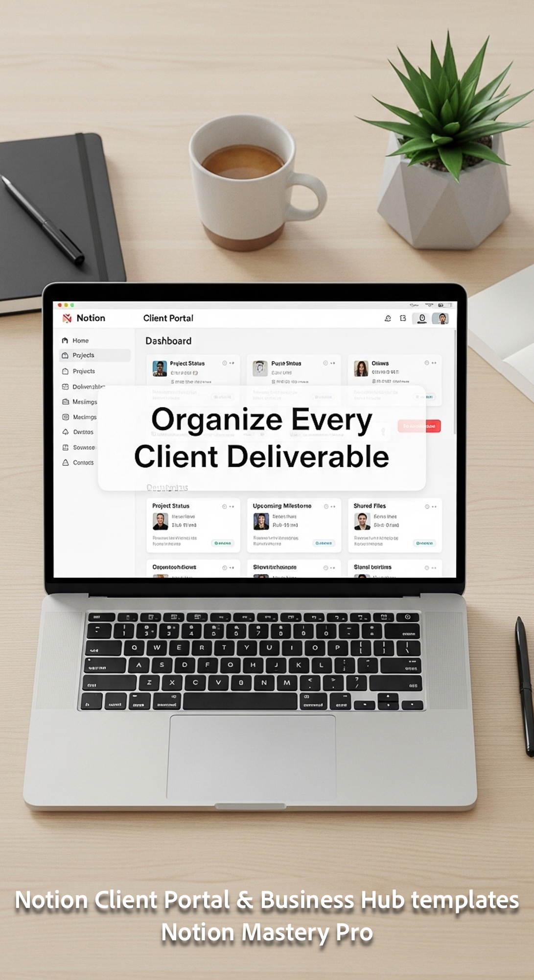 80 Topdown desk shot MacBook showing a Notion Client Portal with a clean sidebar Overlay Organize Ev