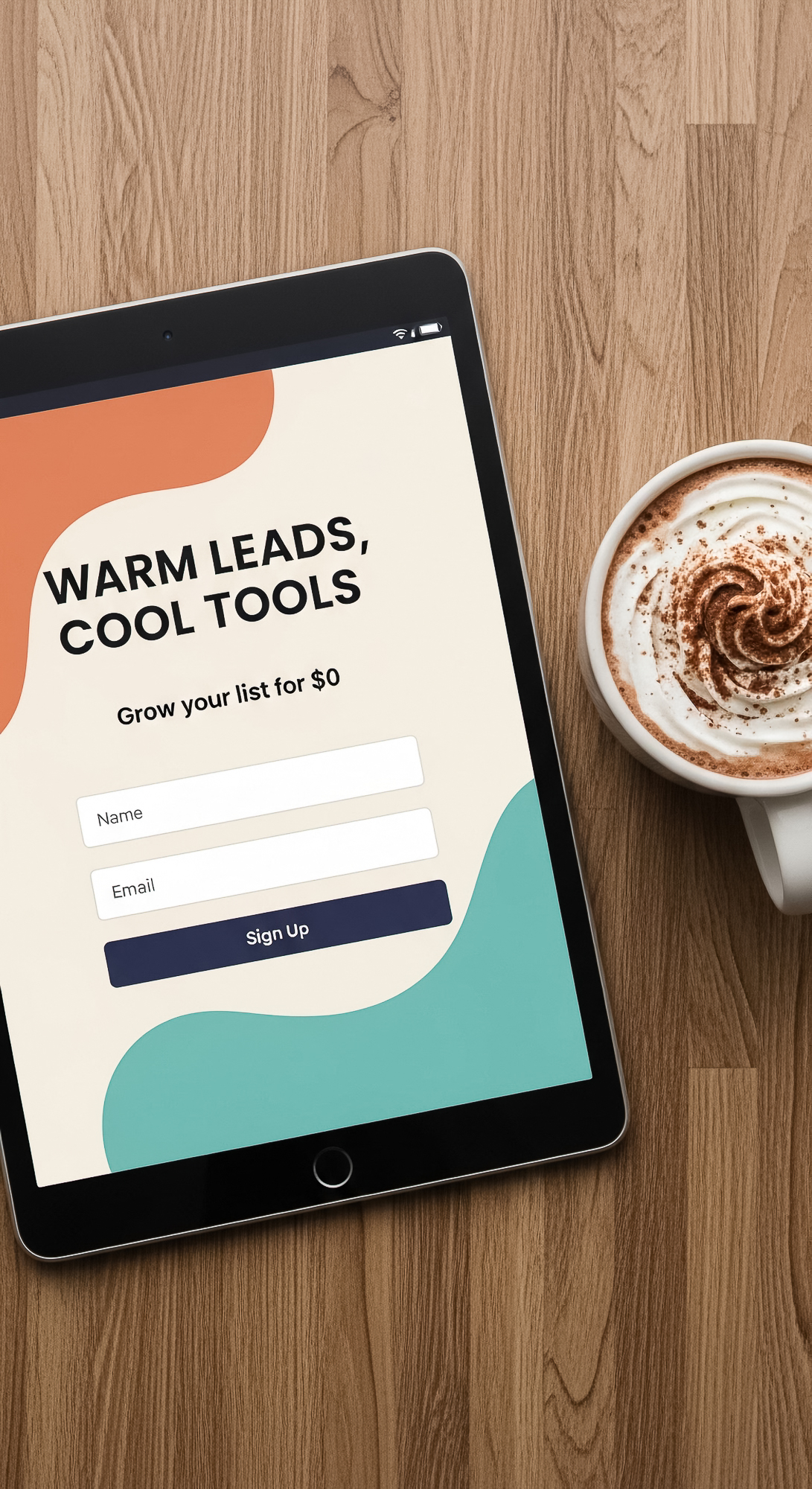 82 Overhead view of a tablet displaying a lead capture page and a cup of cocoa Text WARM LEADS COOL