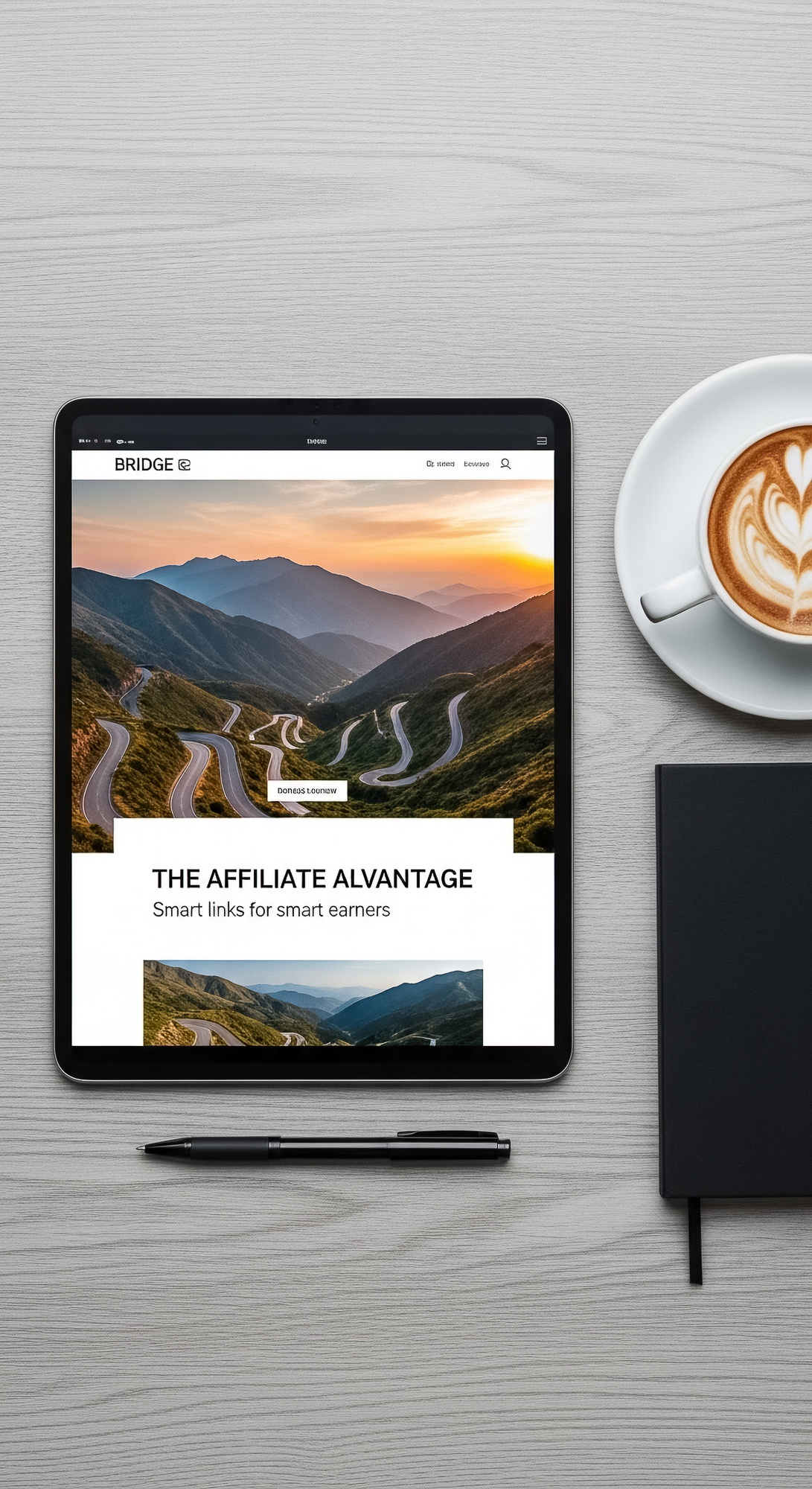 87 Flat lay of a tablet showing a bridge page design and a cup of coffee Text THE AFFILIATE ADVANTAG